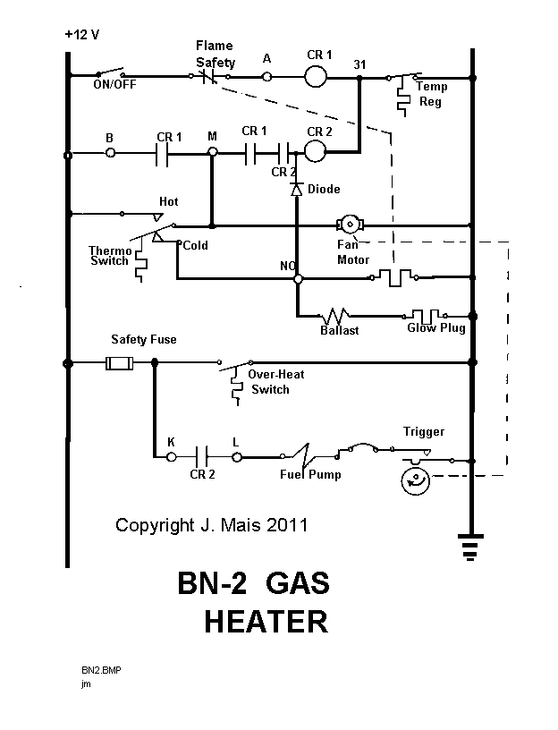The safety fuse is built into the heater. In case of control failure and subsequent over heating, the Over-Heat thermal switch closes. This short circuits the Safety Fuse directly to ground. The fuse blows and the fuel pump can not receive power.