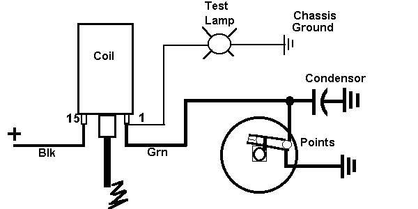 Connect the tester (meter or bulb) from ground (engine case) to Terminal #15 on the coil. Never mind what the actual markings on the coil say; connect to the terminal which has the thick Black wire from the main harness on it. I say never mind the markings on the coil because someone may have swapped wires around which could lead you astray.